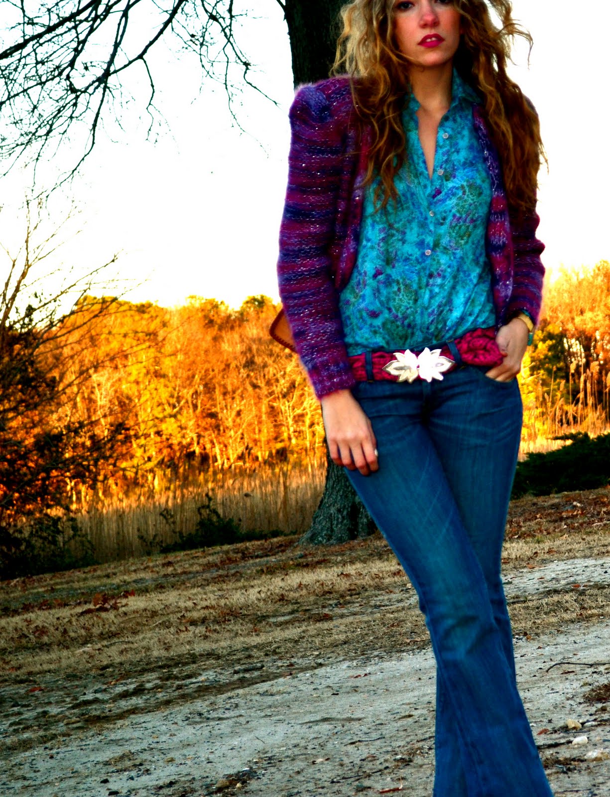 My entire outfit is vintage (metallic mohair cardigan, silk blouse, belt and belt buckle, hammered leather purse, and Levi's bell bottoms) except for the suede Zigi SoHo booties.